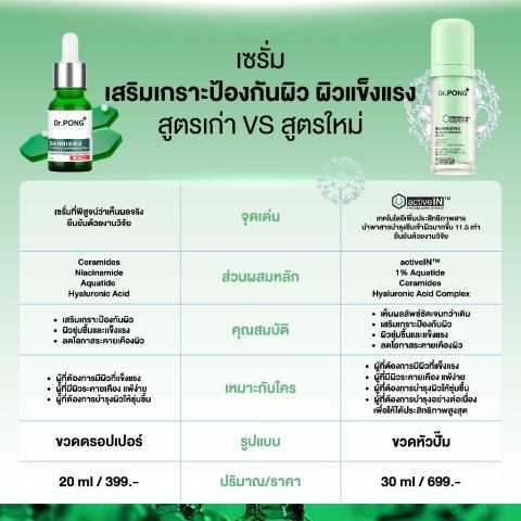 เซรั่มสูตรใหม่! Gen2 Dr.PONG BarrierX activeIN Serum เซรั่มบำรุงผิวหน้าสูตรอัปเกรด เพื่อผิวชุ่มชื้น อิ่มน้ำ แลดูแข็งแรงสุขภาพดีมากกว่าที่เคย มาพร้อมเทคโนโลยี activeIN™ เอกสิทธิ์เฉพาะ Dr.PONG ที่ช่วยเสริมการซึมซาบของสารสำคัญได้ลึกและมีประสิทธิภาพยิ่งขึ้นถึง 11.5 เท่า ช่วยฟื้นบำรุงเกราะป้องกันผิว (Skin Barrier) ให้กลับมาแข็งแรง เหมาะกับทุกสภาพผิว โดยเฉพาะผิวแพ้ง่ายและผิวเป็นสิว