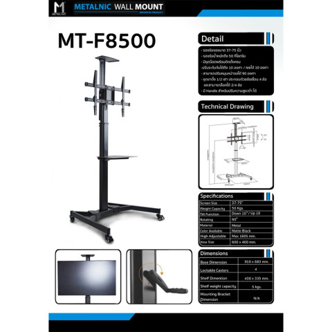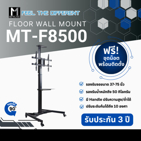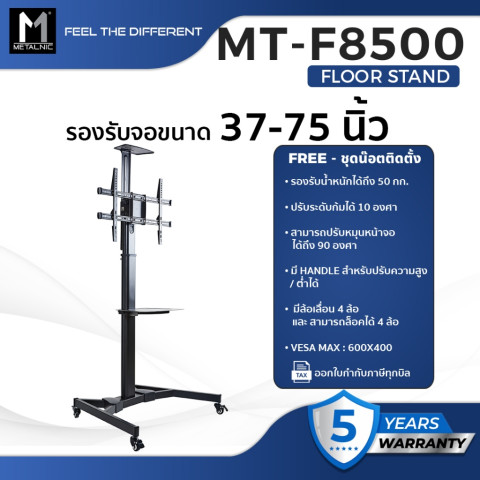 METALNIC MT-F8500 คือโซลูชันขาตั้งจอแบบตั้งพื้นที่ตอบโจทย์ทั้งความแข็งแรง ความยืดหยุ่นในการปรับ และภาพลักษณ์ที่เป็นมืออาชีพ เหมาะสำหรับผู้ที่มองหาขาตั้งทีวีคุณภาพสูงสำหรับงานจริงจังในทุกสภาพแวดล้อม