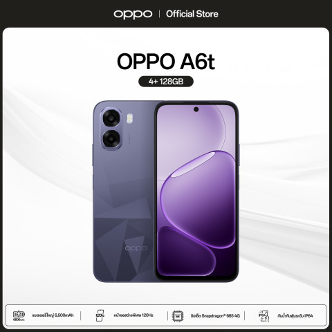 สัมผัสประสบการณ์สมาร์ทโฟนที่ลื่นไหลยิ่งกว่าที่เคยกับ [New] OPPO A6t (4+128G) สมาร์ทโฟนดีไซน์สวย ฟีเจอร์ครบ ใช้งานได้ยาวนานทั้งวันด้วยแบตเตอรี่ขนาดใหญ่ 6500mAh รองรับทุกไลฟ์สไตล์ ไม่ว่าจะเล่นโซเชียล ดูซีรีส์ เล่นเกม หรือทำงานก็ตอบโจทย์ได้ครบในเครื่องเดียว ในราคาสุดคุ้มเพียง ฿5,099.00