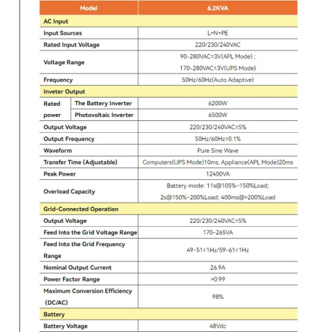กำลังขาออกสูงสุด 6.2KW รองรับโหลดไฟฟ้าหลากหลายประเภท เช่น ตู้เย็น ทีวี แอร์ขนาดเหมาะสม ปั๊มน้ำ และอุปกรณ์ไฟฟ้าในบ้านหรือธุรกิจขนาดเล็ก ด้วยแรงดันเอาต์พุต 230Vac ให้คลื่นไฟฟ้าที่เสถียรเหมาะกับเครื่องใช้ไฟฟ้าส่วนใหญ่MPPT Charger ในตัว 120A