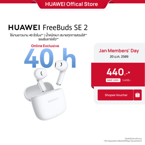HUAWEI FreeBuds SE 2 หูฟังไร้สายที่ตอบโจทย์ทั้งฟังเพลงและคุยสายแบบคมชัด มาพร้อม Bluetooth 5.3 เชื่อมต่อเสถียร เสียงครบย่านด้วยไดร์เวอร์ไดนามิก 10 มม. และแบตเตอรี่ใช้งานยาวนานสูงสุด 40 ชั่วโมง (รวมเคสชาร์จ) ในราคาสบายกระเป๋าเพียง 494.67 บาท