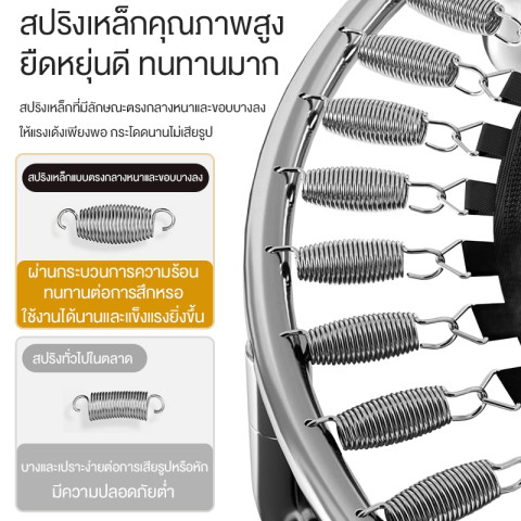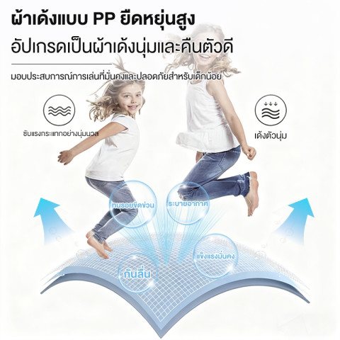 สปริงทำจากเหล็กกัลวาไนซ์คุณภาพสูง ให้แรงดีดตัวที่นุ่มและสนุก แต่ยังคงความแข็งแรง ปลอดภัย รองรับการเล่นของเด็กและผู้ใหญ่ได้อย่างมั่นใจแผ่นรองกระโดด PP เคลือบ UV