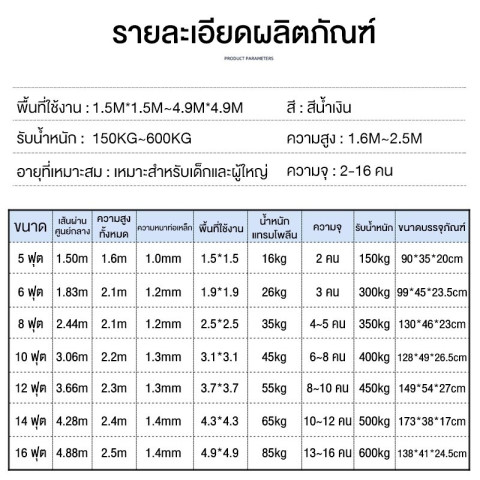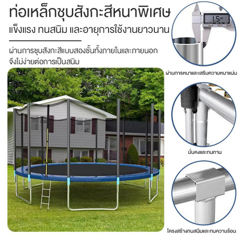ด้วยโครงสร้างเหล็กกัลวาไนซ์หนาถึง 1.4 มม. ผสานกับสปริงคุณภาพสูงและแผ่นรองกระโดดเคลือบ UV ทำให้ทนแดด ทนฝน และใช้งานได้ยาวนาน ตาข่ายนิรภัยรอบด้านช่วยป้องกันการตกหล่น ให้เด็กๆ กระโดดเล่นได้อย่างสบายใจ ผู้ใหญ่ก็สามารถร่วมสนุกได้เช่นกัน