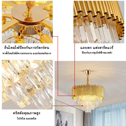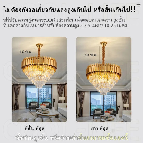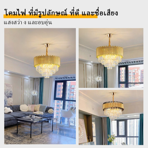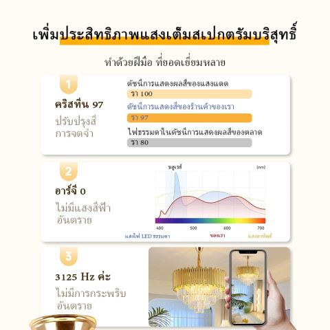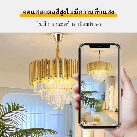 โครงสีทองจับคู่กับคริสตัลเจียระไนใส เล่นแสงได้สวยงาม มองมุมไหนก็โดดเด่น เหมาะทั้งบ้านสไตล์โมเดิร์น มินิมอล หรูหรา หรือยุโรปคลาสสิกไฟ 3 สี ปรับอารมณ์ได้ในโคมเดียว