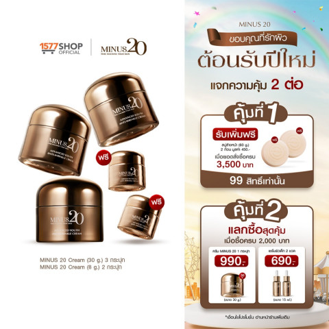 ย้อนวัยผิวให้ตึง ฉ่ำ ไบร์ทแบบสาวสามสิบอีกครั้ง ด้วย Minus20 ไมนัสทเวนตี้ ครีมเกล็ดทองคำ ลดริ้วรอย ผิวตึง ฉ่ำ ไบร์ท ขนาด 30 กรัม x 3 กระปุก + 8 กรัม x 2 กระปุก เซ็ตครีมบำรุงผิวหน้าสูตรแอดวานซ์ ที่ออกแบบมาเฉพาะสำหรับผิววัย 40+ 50+ 60+ ที่ต้องการการดูแลอย่างล้ำลึก ตอบโจทย์ทุกปัญหาผิวของสาวไทยวัยกลางคนที่ผ่านการเปลี่ยนแปลงของฮอร์โมนและเวลา ทั้งริ้วรอยร่องลึก ผิวแห้งกร้าน หมองคล้ำ ฝ้า และจุดด่างดำฝังลึก