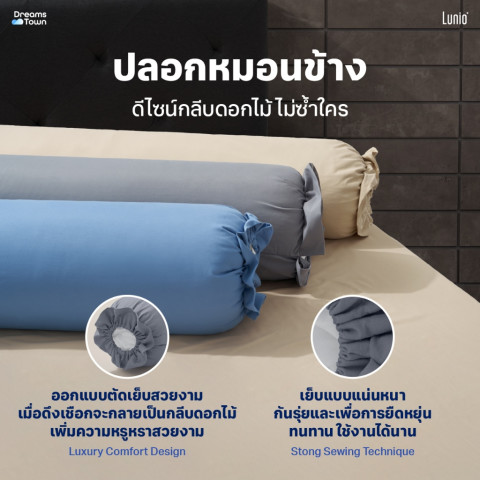 ปลอกหมอนข้างกลีบดอกไม้ ปลายทั้งสองข้างดีไซน์เป็นกรีบโบว์ดอกไม้ เพิ่มลูกเล่นให้เตียงดูสวยมีสไตล์