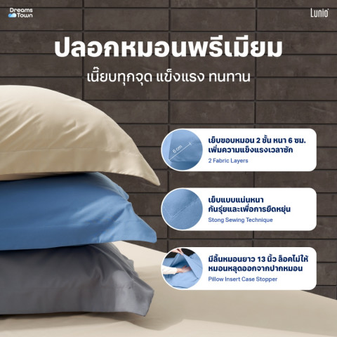 ปลอกหมอนหนุนขอบริ้วกว้าง 6 ซม. ดีไซน์แบบโรงแรมหรู เพิ่มมิติให้เตียงดูเต็มและหรูขึ้น ด้านในเป็นซองลึกยาวถึง 13 นิ้ว ช่วยล็อกหมอนไม่ให้เลื่อนหลุด