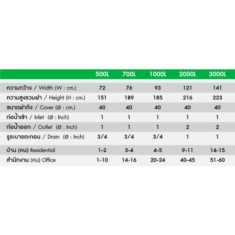 ความจุ: 500, 700, 1000, 2000, 3000 ลิตร (รุ่นยอดนิยม 3000 ลิตร รองรับครอบครัวขนาดใหญ่)