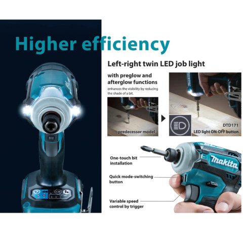 Makita รุ่น DTD171Z สว่านไขควงกระแทก/ไขควงอิมแพคไร้สาย 18V LXT Brushless ที่ออกแบบมาเพื่อการขันสกรูได้รวดเร็ว แม่นยำ และควบคุมง่าย ตัวเครื่องกะทัดรัดพร้อมไฟ LED คู่สองด้าน ช่วยให้ทำงานได้ชัดเจนแม้ในพื้นที่แสงน้อย เหมาะทั้งงานช่างมืออาชีพและงานติดตั้งทั่วไป