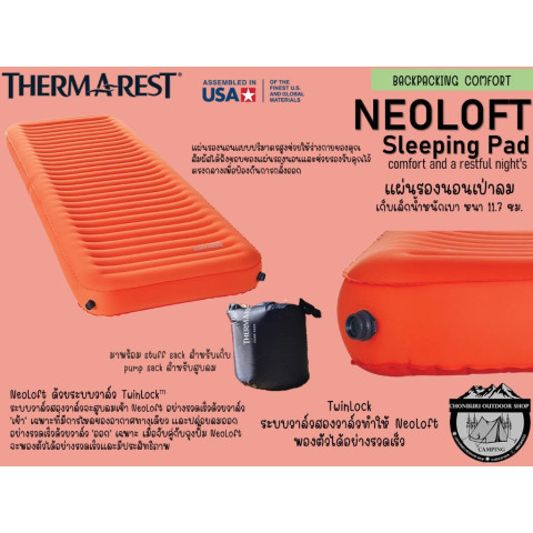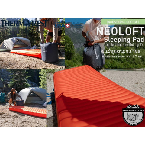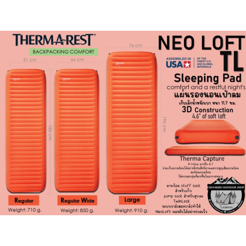 Thermarest NeoLoft TL Sleeping Pad 3D แผ่นรองนอนเป่าลมรุ่นท็อปที่ผสานความเบาแบบสายแบกเป้เข้ากับความสบายแบบที่นอนในแคมป์รถยนต์อย่างลงตัว มอบความหนานุ่มสูงถึง 11.7 ซม. รองรับสรีระเต็มแผ่น หลับสบายเหมือนนอนอยู่บนเตียงจริง แม้ในคืนที่อุณหภูมิลดต่ำก็อุ่นได้สบายด้วยค่า R-Value 4.7
