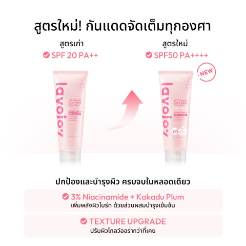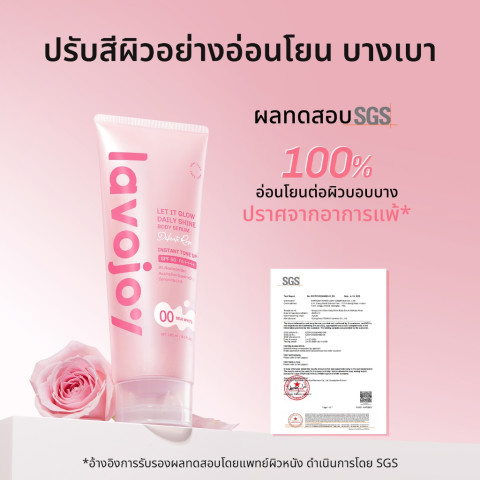 เผยผิวสว่างโกลว์ฉ่ำแบบเป็นธรรมชาติในขั้นตอนเดียวกับ lavojoy Let It Glow Daily Shine Body Serum Delicate Rose SPF 50 PA++++ โทนอัพบอดี้เซรั่มเนื้อบางเบา กลิ่นกุหลาบหอมละมุน ที่ช่วยทั้งปรับโทนผิวให้กระจ่างใสทันที พร้อมบำรุงผิวระยะยาวและปกป้องผิวจากแสงแดดในทุกวัน