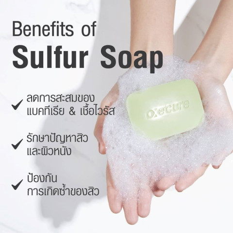 สบู่ซัลเฟอร์โซพเข้มข้น ช่วยลดการสะสมแบคทีเรีย ผลัดเซลล์ผิวเสื่อม พร้อมสารสกัดใบชาเขียว เปลือกมังคุด และโปรตีนถั่วเหลืองที่ผสานซัลเฟอร์ ปลอบประโลมผิวและล็อกความชุ่มชื้น