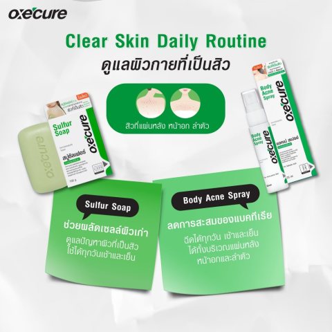 ปลดล็อกผิวกายใสไร้สิวด้วย [SAVE SET] Oxe'cure Acne Care Set ชุดคู่ซัลเฟอร์โซพ 100 กรัม และบอดี้แอคเน่สเปรย์ 50 มล. ที่ออกแบบมาเพื่อจัดการสิวที่ก่อกวนผิวทุกอณู ทั้งช่วยกำจัดต้นตอสิว ควบคุมความมัน ฟื้นฟูโปร่งใส และสร้างเกราะปกป้องผิวให้กลับมามั่นใจได้ในทุกลุค