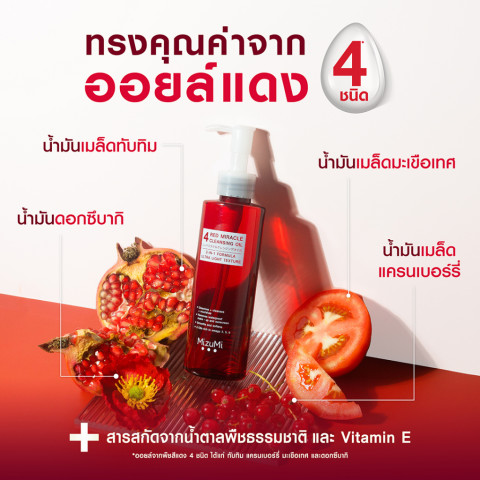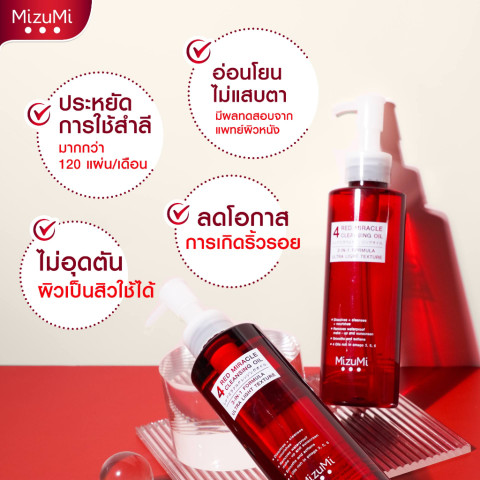 MizuMi 4 Red Miracle Cleansing Oil 150ml คลีนซิ่งออยล์สูตร 3-IN-1 ที่ทั้ง สลายเครื่องสำอาง + ทำความสะอาด + บำรุงผิว ในขั้นตอนเดียว เนื้อออยล์บางเบาพิเศษ ล้างออกง่าย ไม่เหนอะหนะ ช่วยสลายเมคอัพกันน้ำและครีมกันแดดได้อย่างหมดจด พร้อมมอบความชุ่มชื้นให้ผิวสะอาด นุ่ม และแข็งแรงขึ้นทันทีหลังใช้