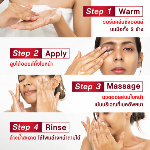 นวดเบาๆ ลงบนผิวหน้าและรอบดวงตาที่แห้ง เพื่อสลายเมคอัพและสิ่งสกปรก
