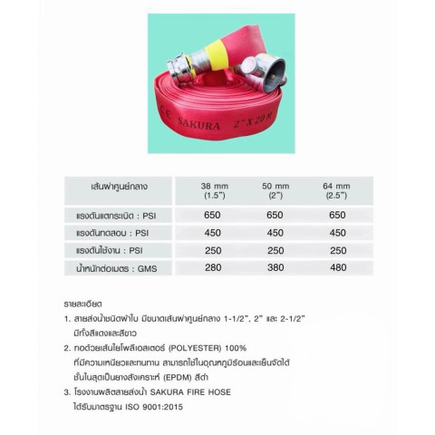 หากคุณกำลังมองหาสายส่งน้ำดับเพลิงที่ทั้งทนทาน มั่นใจได้ในยามฉุกเฉิน และคุ้มค่าในการลงทุน สายส่งน้ำ สายดับเพลิงสีแดง ยี่ห้อ “SAKURA” รุ่นผ้าใบ 2 ชั้น เคลือบยาง ELASTOMER คือทางเลือกที่ตอบโจทย์ทั้งด้านความปลอดภัยและความทนทานในระยะยาว