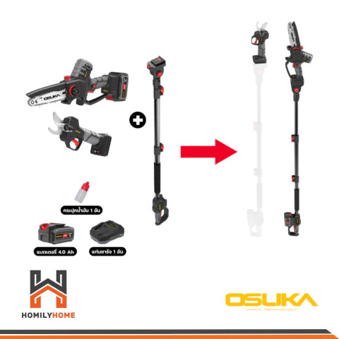 OSUKA เครื่องมือตัดแต่งกิ่งไร้สาย 20V ครบจบงานสวนในชุดเดียว เลือกได้ทั้ง เลื่อยไฟฟ้าไร้แปรงถ่าน สำหรับตัดกิ่งไว ตัดลื่น และ กรรไกรตัดกิ่งไร้สาย สำหรับงานตัดแต่งที่คมเนี้ยบ พร้อมตัวเลือก ด้ามต่อสูง ช่วยตัดกิ่งบนที่สูงได้ปลอดภัย ไม่ต้องปีนบันได เหมาะกับทั้งงานสวนบ้านและงานดูแลต้นไม้ประจำสวน