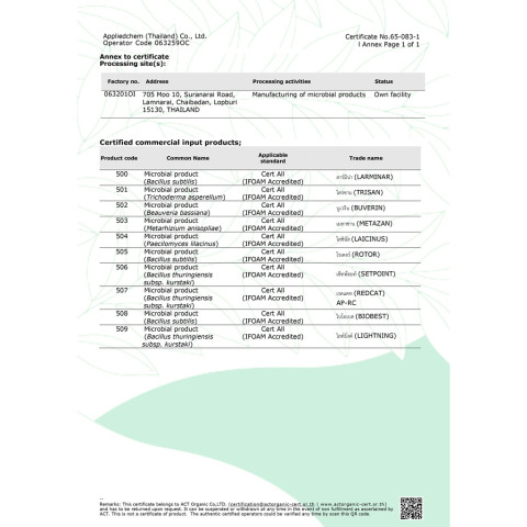 สารสำคัญ: Bacillus thuringiensis var. kurstaki (สายพันธุ์เคอร์สตากี้)