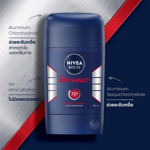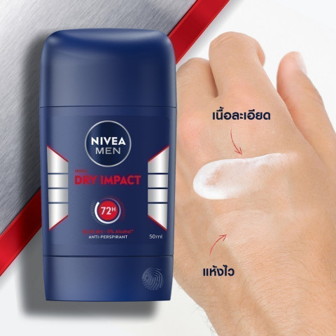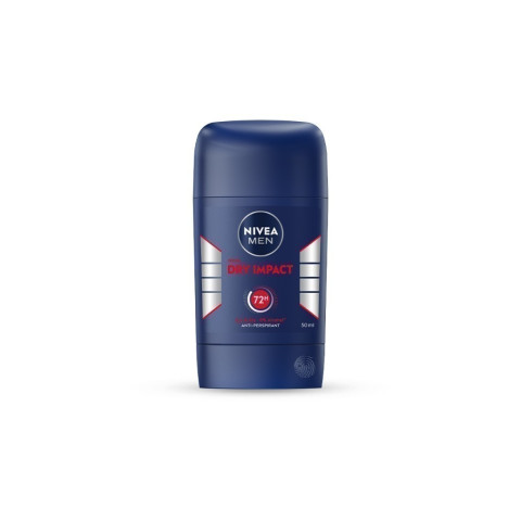 นีเวีย เมน ดราย อิมแพ็ค สติ๊ก 50 มล. (NIVEA MEN DRY IMPACT STICK) สติ๊กระงับเหงื่อและกลิ่นกายสำหรับผู้ชาย ให้ใต้วงแขนแห้งสบาย มั่นใจได้ยาวนานตลอดวัน ด้วยสูตร Dual Active ผสานพลังสารลดเหงื่อ 2 ชนิด ช่วยลดการสะสมของแบคทีเรียซึ่งเป็นหนึ่งในสาเหตุของกลิ่นกาย พร้อมการดูแลผิวอย่างอ่อนโยน