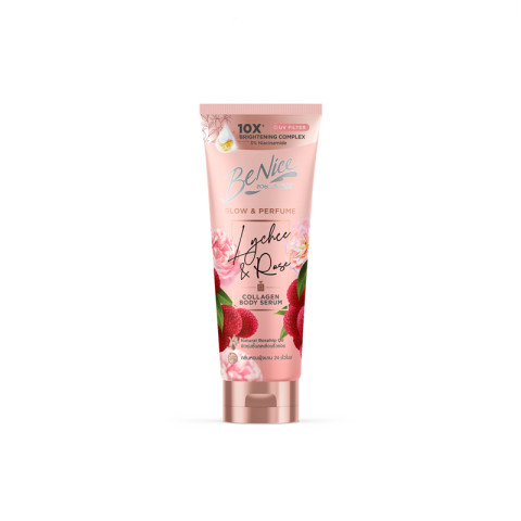 เจลอาบน้ำเนื้อสัมผัสพรีเมียมแบบมุก (Pearlized Texture) ให้ฟีลลักชูขณะอาบน้ำ ช่วยทำความสะอาดผิวพร้อมบำรุงให้ผิวดูนุ่มและโกลว์ขึ้นหลังอาบบีไนซ์ โกลว์ แอนด์ เพอร์ฟูม ไลชี่ แอนด์ โรส คอลลาเจน บอดี้ เซรั่ม 170 มล.