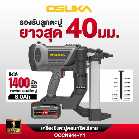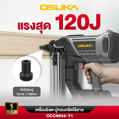 OSUKA เครื่องยิงตะปูคอนกรีต ไร้สาย 20V รุ่น OCCN944-Y พลังแรง ยิงเร็ว แม่นยำ ออกแบบมาเพื่อช่างมืออาชีพที่ต้องการความคล่องตัวในหน้างาน ไม่ต้องพึ่งสายลมหรือคอมเพรสเซอร์ ให้แรงยิงระดับสูงสุด 90–120J เจาะเข้าปูนแข็งได้อย่างมีประสิทธิภาพ พร้อมระบบเกียร์กันติดขัด ใช้งานต่อเนื่องได้มั่นใจ เหมาะสำหรับงานติดตั้งท่อไฟ ท่อแอร์ งานโครงสร้าง และงานก่อสร้างที่ต้องการความเร็วและความชัวร์