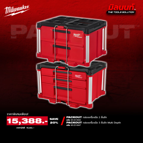 Milwaukee - PACKOUT Q4 ชุดกล่องเครื่องมือ 2 ลิ้นชัก + กล่องเครื่องมือ 3 ลิ้นชัก Multi Depth ยกระดับการจัดเก็บเครื่องมือให้เป็นระบบ หยิบใช้งานง่าย และเคลื่อนย้ายสะดวกด้วยชุดลิ้นชักจากระบบ PACKOUT ที่ออกแบบมาสำหรับงานช่างตัวจริง เหมาะทั้งงานหน้างานและเวิร์กช็อป จัดเก็บได้ตั้งแต่เครื่องมือช่างชิ้นเล็ก อุปกรณ์สิ้นเปลือง ไปจนถึงเครื่องมือขนาดกลาง ด้วยลิ้นชักหลายระดับที่ช่วยแยกประเภทได้ชัดเจน