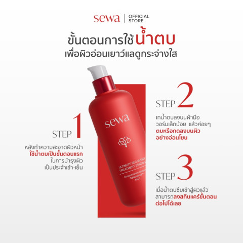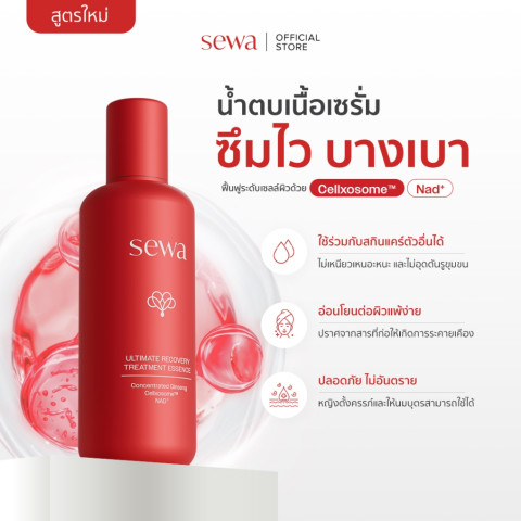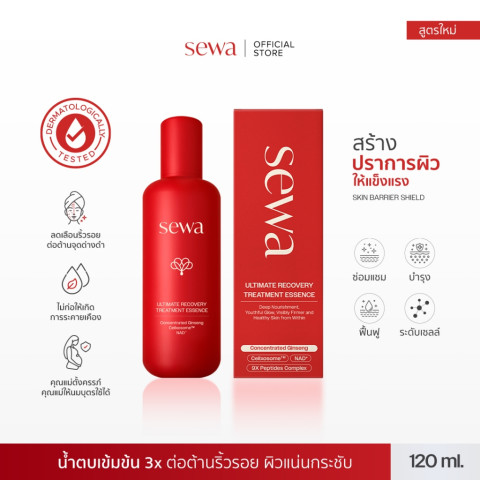 [น้ำตบเจนเย่] Sewa Ultimate Recovery Treatment Essence เอสเซนส์น้ำตบลดเลือนริ้วรอยและต่อต้านริ้วรอย ช่วยให้ผิวดูแน่นกระชับ เอิบอิ่ม ฉ่ำฟูตั้งแต่ครั้งแรกที่ใช้ พร้อมฟื้นฟูเกราะป้องกันผิวลึกถึงระดับเซลล์ และช่วย “เปิดผิว” ให้รับการบำรุงในขั้นตอนถัดไปได้ดียิ่งขึ้น เหมาะสำหรับคนที่กังวลเรื่องผิวหย่อนคล้อย รูขุมขนไม่กระชับ ผิวหยาบกร้านหรือไม่เรียบเนียน เพื่อผิวที่ดูอ่อนเยาว์ เนียนนุ่ม และแข็งแรงขึ้นอย่างเป็นธรรมชาติ