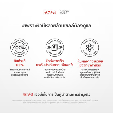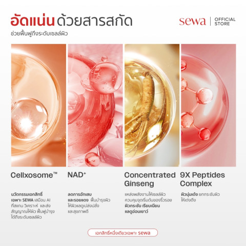 Cellxosome™ (เทคโนโลยีเอกสิทธิ์ของ Sewa จาก Cica Stem Cell): ช่วยสนับสนุนการฟื้นฟูผิวในระดับเซลล์ เสริมการทำงานของเกราะผิวให้แข็งแรง