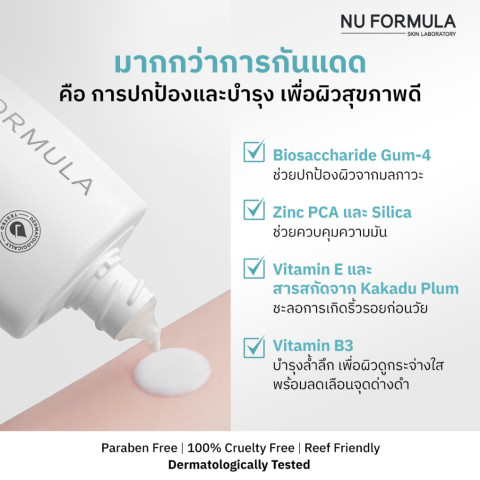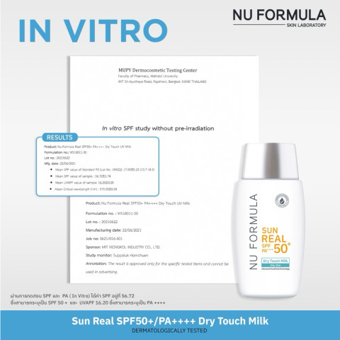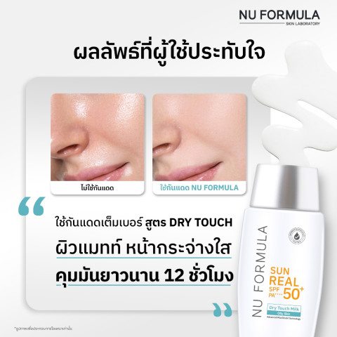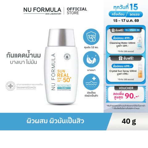 Nu Formula Sun Real SPF50+/PA++++ Dry Touch Milk 40g กันแดดเนื้อน้ำนมบางเบา ให้การปกป้องสูง พร้อมฟินิชแบบแห้งสบายผิว เหมาะสำหรับคนที่มองหากันแดดคุมมัน ไม่เหนอะหนะ และช่วยให้ผิวดูเรียบเนียนขึ้นทันทีหลังทา