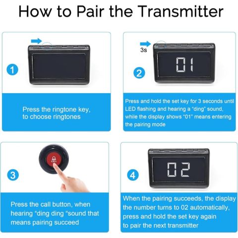 ต้องการจับคู่เพิ่ม: กดปุ่มตั้งค่าค้าง ~3 วินาทีจนไฟ LED กระพริบ จากนั้นกดปุ่มเรียกเพื่อจับคู่ให้สำเร็จ