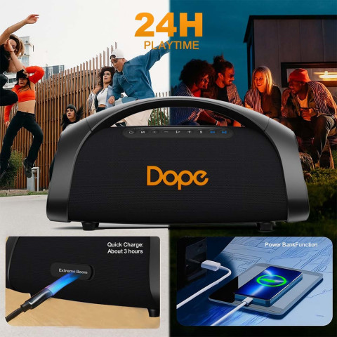 Dope Extreme Boom ลำโพงพกพา ไร้สาย ขนาดใหญ่ by munkong คือคำตอบของสายปาร์ตี้ที่อยากได้ “พลังเสียงจริง” แบบเปิดได้สุด สนุกได้ทั้งร้องเพลงและใช้งานกลางแจ้ง ด้วยกำลังขับ 200W RMS พร้อม DSP ช่วยคุมโทนเสียงให้คมชัดทุกระดับ เพิ่มบรรยากาศให้มันส์ยิ่งขึ้นด้วย ไฟ RGB Rhythm Display ที่วิ่งตามจังหวะเพลง และใช้งานได้อุ่นใจด้วยมาตรฐานกันน้ำ IPX6