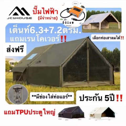 ประกัน 5 ปี ส่งฟรี 🔥พร้อมส่งทันทีใน 24 ชม.🔥 พบกับ JC&house เต็นท์เสาลม 6.3+7.2 ตร.ม. เต็นท์เป่าลมขนาดใหญ่ที่กางง่าย ใช้งานจริงจัง เหมาะทั้งสายแคมป์ครอบครัวและสายอุปกรณ์ครบชุด มาพร้อม เรนโคเวอร์ และจุดเด่นสุดคุ้มอย่าง ช่องใส่ท่อแอร์ เพิ่มความสบายในทุกสภาพอากาศ พร้อม ประตู TPU บานใหญ่ ช่วยกันลมกันฝุ่น มองวิวได้เต็มตา และช่วยรับแสงอย่างเป็นธรรมชาติ