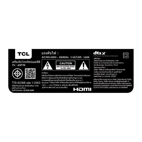 การรับประกัน: 3 ปี โดย บริษัท ทีซีแอล อิเล็กทรอนิกส์ (ไทยแลนด์) จำกัด