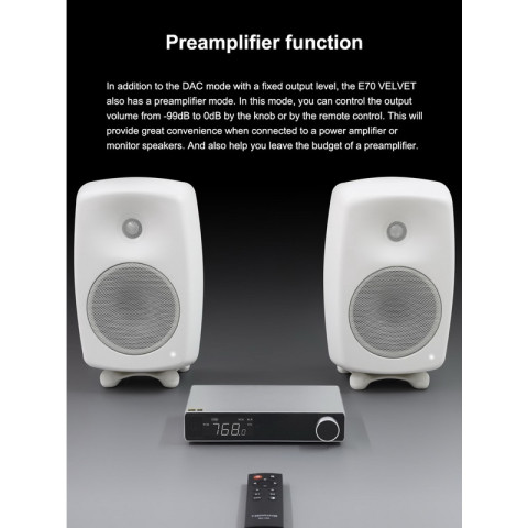 โหมดปรีแอมป์ในตัว ปรับวอลุ่มเอาต์พุตได้ตั้งแต่ -99 dB ถึง 0 dB ผ่านปุ่มหรือรีโมท ใช้ต่อกับเพาเวอร์แอมป์/ลำโพงมอนิเตอร์ได้สะดวก