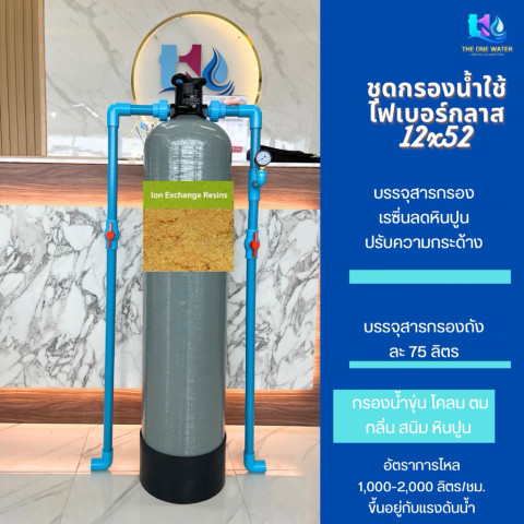 กรองน้ำใช้ถังกรองไฟเบอร์ 12x52 พร้อมสารกรองเรซิ่น ราคา 5,983.00 บาท ชุดกรองน้ำสำหรับบ้านและงานใช้น้ำทั่วไป ช่วย ลดหินปูน และ ปรับความกระด้างของน้ำ ให้เหมาะกับการใช้งานมากขึ้น เหมาะสำหรับผู้ที่มีปัญหาน้ำกระด้าง คราบตะกรันตามก๊อก/ฝักบัว และต้องการดูแลอุปกรณ์ใช้น้ำให้ใช้งานได้ยาวนาน