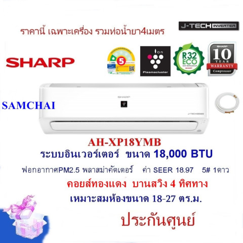 แอร์ SHARP รุ่น AH-XP18YMB ขนาด 18,000 BTU แอร์ติดผนังระบบอินเวอร์เตอร์ พร้อมคอยล์ทองแดงแท้ และระบบฟอกอากาศ Plasmacluster ช่วยให้อากาศสะอาด ลดกลิ่นไม่พึงประสงค์ และเสริมความสบายในการพักผ่อน เหมาะกับห้องขนาดประมาณ 18–27 ตร.ม. (ราคาเฉพาะเครื่อง รวมชุดท่อน้ำยา 4 เมตร)
