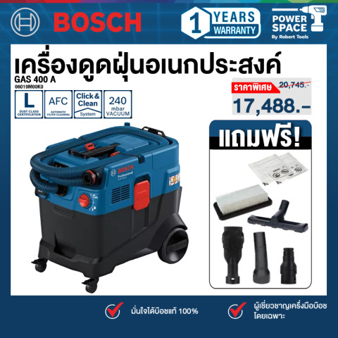 BOSCH รุ่น GAS 400 A (06019M00K0) เครื่องดูดฝุ่น/ดูดน้ำอเนกประสงค์ความจุ 40 ลิตร กำลังดูดทรงพลัง เหมาะสำหรับงานช่าง งานไซต์งาน และการทำความสะอาดพื้นที่ขนาดใหญ่ ใช้งานได้ต่อเนื่องเต็มประสิทธิภาพด้วยระบบทำความสะอาดแผ่นกรองอัตโนมัติ (AFC) เอกสิทธิ์เฉพาะจากบ๊อช ลดการอุดตัน เพิ่มแรงดูดสม่ำเสมอ พร้อมระบบต้านไฟฟ้าสถิตช่วยเพิ่มความปลอดภัยและความมั่นใจระหว่างใช้งาน