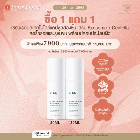 1 แถม 1 02.69 VENN (เวนน์) Retinal Infusion MLV10 Serum เซรั่มเรติแนลแคปซูลสองชั้นที่ออกแบบมาเพื่อดูแลผิวแบบเข้มข้น ช่วยให้ผิวดูเรียบเนียน กระจ่างใส และดูอ่อนเยาว์ยิ่งขึ้น ด้วยการผสานพลังของ Retinal (เรติแนล) ในรูปแบบแคปซูลสองชั้นเพื่อช่วยคงความสดใหม่ของสารสำคัญ พร้อมเสริมด้วย Exosome และ Centella 3 เพื่อช่วยปลอบประโลมและเสริมความแข็งแรงของเกราะปกป้องผิว เหมาะสำหรับผู้ที่ต้องการอัปเกรดการดูแลผิวช่วงกลางคืนให้เห็นผลชัดเจนยิ่งขึ้น