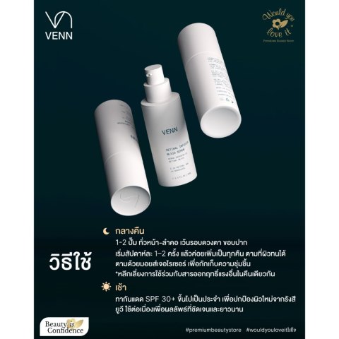 วิธีใช้ (แนะนำ): ใช้ในตอนกลางคืน หลังทำความสะอาดผิวและลงโทนเนอร์ ทาเซรั่มในปริมาณพอเหมาะให้ทั่วใบหน้าและลำคอ จากนั้นตามด้วยมอยส์เจอไรเซอร์ เริ่มใช้สัปดาห์ละ 2–3 ครั้งแล้วค่อยเพิ่มความถี่ตามสภาพผิว