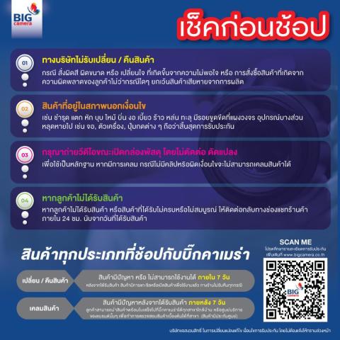 สามารถนำสินค้าและใบเสร็จไปตรวจสอบได้ที่ บิ๊กคาเมร่า ทุกสาขาใกล้บ้าน หรือศูนย์บริการของแบรนด์