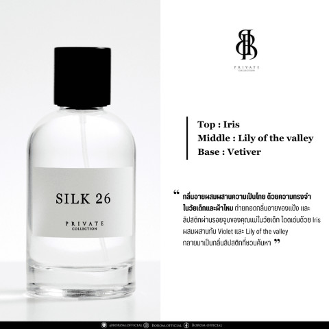 BOROM SILK 26 SIZE 100 ml. น้ำหอมจากคอลเลกชันที่ถ่ายทอดเสน่ห์ของ “ผ้าไหม” อาภรณ์อันเลอค่าที่สะท้อนความเป็นไทยและเป็นที่ยอมรับในระดับโลก ผ่านกลิ่นหอมละมุนที่ชวนหวนคิดถึงวันวานอย่างมีรสนิยม เหมาะสำหรับผู้ที่รักความคลาสสิก เรียบหรู และมีเรื่องราวในทุกสัมผัส