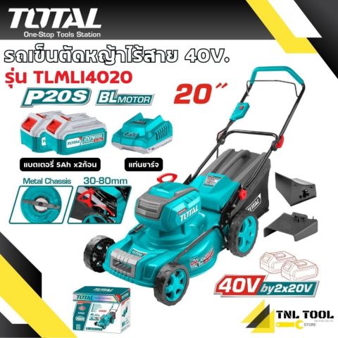 รถเข็นตัดหญ้าไร้สาย TOTAL 40V (20V+20V) ขนาด 20 นิ้ว รุ่น TLMLI4020 ตัวช่วยดูแลสนามให้เรียบร้อยอย่างมืออาชีพ ด้วยมอเตอร์ Brushless ให้แรงบิดดี อายุการใช้งานยาว และรอบหมุนสูงสุด 2800 rpm ตัดได้กว้างถึง 510 มม. เก็บงานไว เหมาะกับสนามหญ้าบ้าน สวน หรือพื้นที่รอบอาคารที่ต้องการความคล่องตัวแบบไร้สาย