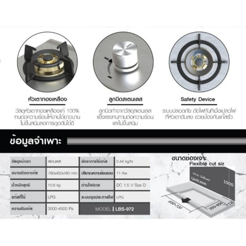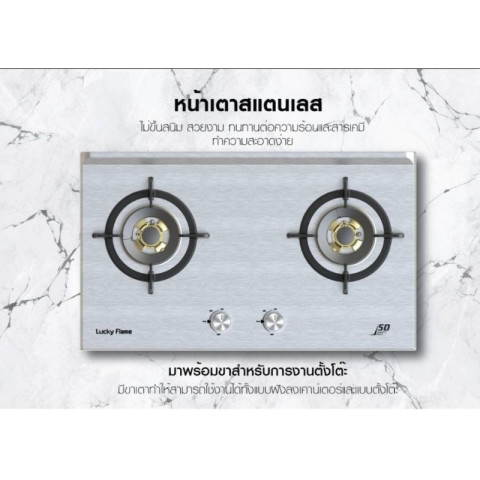 Luckyflame เตาฝังหน้าสแตนเลส รุ่น LBS-972 เตาแก๊สดีไซน์สวย แข็งแรง ใช้งานได้ทั้งแบบฝังเคาน์เตอร์และตั้งโต๊ะ มาพร้อมนวัตกรรมช่องอากาศด้านบน ช่วยระบายอากาศได้ดี แม้ติดตั้งกับตู้ทึบก็ยังใช้งานได้อย่างมั่นใจ เหมาะสำหรับครัวบ้านและครัวที่ต้องการเตาไฟแรง ทนทาน และดูแลง่าย