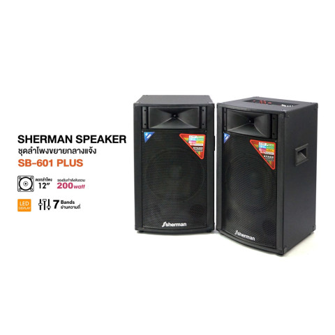 Sherman ชุดลำโพงขยายกลางแจ้ง รุ่น SB-601 Plus พลังเสียงจัดเต็มสำหรับงานอีเวนต์ งานสังสรรค์ ห้องประชุม หรือใช้งานกลางแจ้ง ด้วยระบบลำโพง 2.0 แบบภาคขยายในตัว ดอกลำโพงเบสขนาด 12 นิ้ว พร้อมทวีตเตอร์แบบปากเป็ด ให้เสียงทุ้มแน่น กลางชัด แหลมใส ปรับโทนเสียงได้ตามสไตล์ และรองรับการเล่นเพลงได้หลากหลายทั้ง Bluetooth และ USB/SD เหมาะทั้งฟังเพลงและร้องคาราโอเกะในชุดเดียว