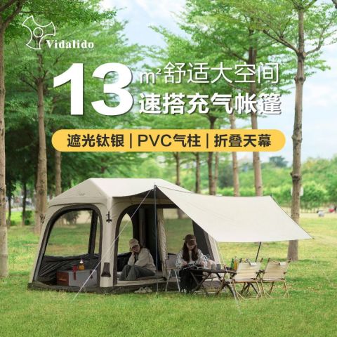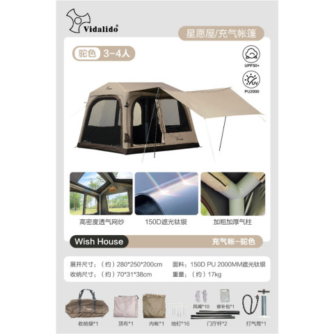 เต็นท์เป่าลม Vidalido Wish House สำหรับตั้งแคมป์กลางแจ้ง กันฝน ราคา 9,030.00 บาท ดีไซน์ทรงบ้านสุดอบอุ่น กางใช้งานได้จริงสำหรับสายแคมป์ที่ต้องการพื้นที่กว้าง นอนสบาย 3-4 คน โครงสร้างแบบเต็นท์เป่าลมช่วยให้โครงเต็นท์ตั้งทรงได้มั่นคง เหมาะกับการออกทริปได้ตลอดทั้งปี พร้อมผ้า Oxford ที่ทั้งทนทานและกันฝน เหมาะทั้งแคมป์ป่า ลานกางเต็นท์ หรือทริปครอบครัว