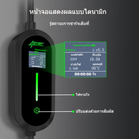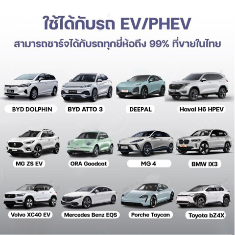 6A: 1.5kW, 8A: 1.8kW, 10A: 2.2kW, 13A: 2.8kW, 16A: 3.5kW, 20A: 4.5kW, 24A: 5.5kW, 30A: 6.2kW, 32A: 7.2kWการใช้งาน: ดีไซน์พกพา เหมาะทั้งในบ้าน/นอกสถานที่