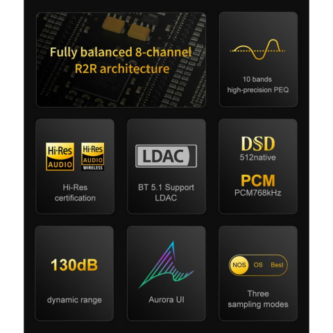 ค่า THD+N ต่ำถึง 0.0005%, SNR 130dB @1kHz และ DNR 130dB @1kHz ช่วยให้ถ่ายทอดรายละเอียด ไดนามิก และมิติของเพลงได้อย่างสมจริง ลดสัญญาณรบกวนและความเพี้ยนให้น้อยที่สุดเลือกโทนเสียงได้ 3 โหมด: NOS / OS / Best