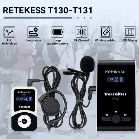 Retekess T130 ระบบพานำเที่ยว 99 ช่อง (สำหรับฮัจญ์/อุมเราะห์, แปลภาษาในคริสตจักร, ห้องอบรม และล่าม) คือชุดส่ง-รับเสียงไร้สายที่ออกแบบมาเพื่อการสื่อสารแบบชัดเจนเป็นส่วนตัว เหมาะสำหรับผู้นำทัวร์/ผู้นำกลุ่ม ผู้บรรยาย ครูฝึก และล่าม ที่ต้องการกระจายเสียงให้ผู้ฟังหลายคนพร้อมกัน โดยผู้ฟังสามารถเลือกช่องสัญญาณได้สูงสุดถึง 99 ช่อง ลดการรบกวนเมื่อมีหลายกลุ่มใช้งานในพื้นที่เดียวกัน