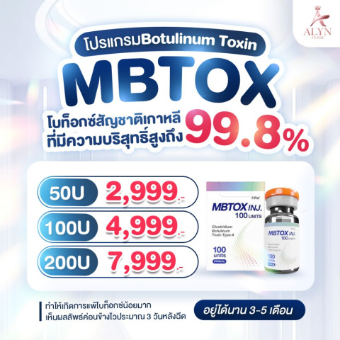 โบท็อกซ์ MBTOX 200U (เกาหลี) จาก Alyn clinic อลินคลินิค โบท็อกซ์สัญชาติเกาหลีที่โดดเด่นด้วยความบริสุทธิ์สูงถึง 99.8% ช่วยให้การฉีดมีความสะอาดและให้ผลลัพธ์ที่มีประสิทธิภาพ เหมาะสำหรับผู้ที่ต้องการลดเลือนริ้วรอย ปรับรูปหน้าให้ดูเรียวสวย และยกกระชับผิวให้ดูสดใสอย่างเป็นธรรมชาติ