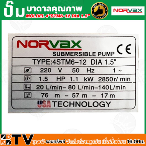 NORVAX ปั๊มบาดาล 1.5 HP รุ่น 4”STM6-12 ออกแบบมาเพื่อการสูบน้ำจากบ่อบาดาลที่ต้องการ แรงดันดี ส่งน้ำได้ไกล เหมาะทั้งงานบ้าน งานสวน และงานเกษตรที่ต้องการน้ำสม่ำเสมอ พร้อม สายไฟยาว 50 เมตร ช่วยให้ติดตั้งได้สะดวกยิ่งขึ้น และมั่นใจได้ด้วยการ รับประกันคุณภาพ จากแบรนด์ NORVAX ในราคาคุ้มค่า 5,350.00 บาท